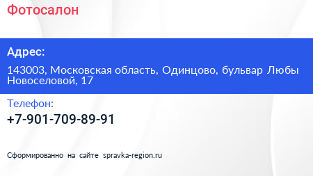 Фотосалон по адресу 143003, Московская область, Одинцово, бульвар Любы Новоселовой, 17 в дальнейшем Организация, размещена в следующих категориях: