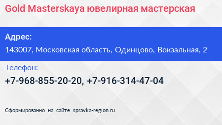 Gold-Masterskaya, ювелирная мастерская по адресу 143007, Московская область, Одинцово, Вокзальная, 2 в дальнейшем Организация, размещена в следующих категориях: