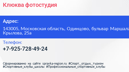 Клюква, фотостудия по адресу 143005, Московская область, Одинцово, бульвар Маршала Крылова, 25а в дальнейшем Организация, размещена в следующих категориях:
