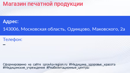 Магазин печатной продукции по адресу 143006, Московская область, Одинцово, Маковского, 2а в дальнейшем Организация, размещена в следующих категориях: