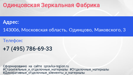 Одинцовская Зеркальная Фабрика по адресу 143006, Московская область, Одинцово, Маковского, 3 в дальнейшем Организация, размещена в следующих категориях: