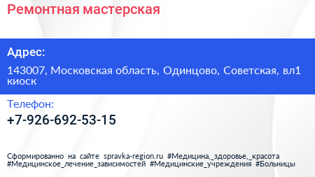 Ремонтная мастерская по адресу 143007, Московская область, Одинцово, Советская, вл1 киоск в дальнейшем Организация, размещена в следующих категориях: