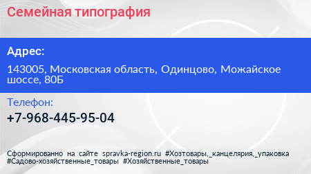 Семейная типография по адресу 143005, Московская область, Одинцово, Можайское шоссе, 80Б в дальнейшем Организация, размещена в следующих категориях: