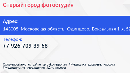 Старый город, фотостудия по адресу 143005, Московская область, Одинцово, Вокзальная 1-я, 52 в дальнейшем Организация, размещена в следующих категориях: