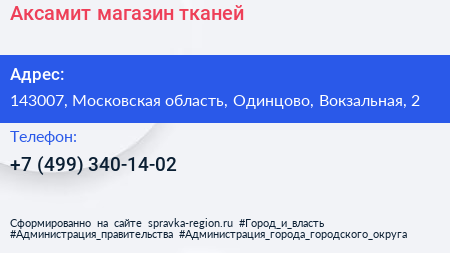 Аксамит, магазин тканей по адресу 143007, Московская область, Одинцово, Вокзальная, 2 в дальнейшем Организация, размещена в следующих категориях: