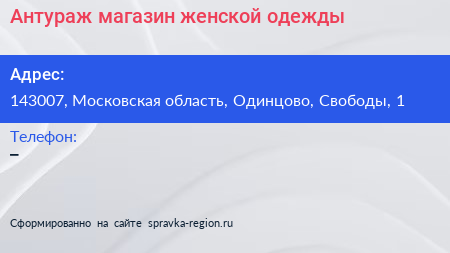 Антураж, магазин женской одежды по адресу 143007, Московская область, Одинцово, Свободы, 1 в дальнейшем Организация, размещена в следующих категориях:
