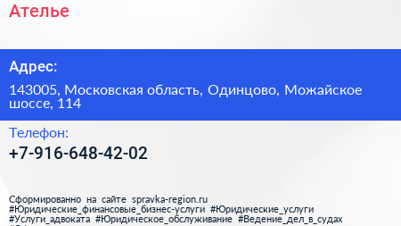Ателье по адресу 143005, Московская область, Одинцово, Можайское шоссе, 114 в дальнейшем Организация, размещена в следующих категориях: