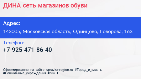 ДИНА, сеть магазинов обуви по адресу 143005, Московская область, Одинцово, Говорова, 163 в дальнейшем Организация, размещена в следующих категориях: