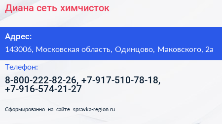 Диана, сеть химчисток по адресу 143006, Московская область, Одинцово, Маковского, 2а в дальнейшем Организация, размещена в следующих категориях: