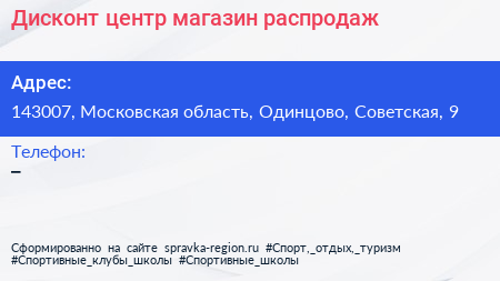 Дисконт центр, магазин распродаж по адресу 143007, Московская область, Одинцово, Советская, 9 в дальнейшем Организация, размещена в следующих категориях: