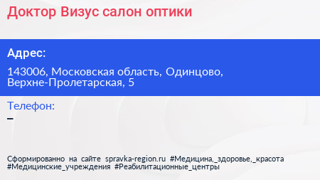 Доктор Визус, салон оптики по адресу 143006, Московская область, Одинцово, Верхне-Пролетарская, 5 в дальнейшем Организация, размещена в следующих категориях: