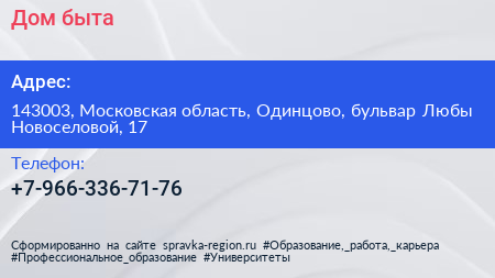 Дом быта по адресу 143003, Московская область, Одинцово, бульвар Любы Новоселовой, 17 в дальнейшем Организация, размещена в следующих категориях: