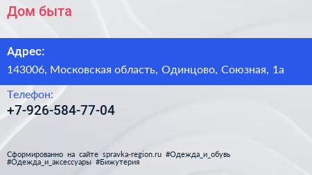 Дом быта по адресу 143006, Московская область, Одинцово, Союзная, 1а в дальнейшем Организация, размещена в следующих категориях: