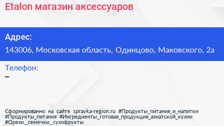 Etalon, магазин аксессуаров по адресу 143006, Московская область, Одинцово, Маковского, 2а в дальнейшем Организация, размещена в следующих категориях: