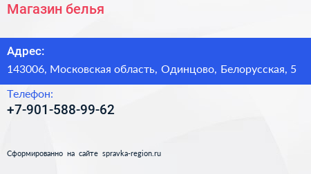 Магазин белья по адресу 143006, Московская область, Одинцово, Белорусская, 5 в дальнейшем Организация, размещена в следующих категориях: