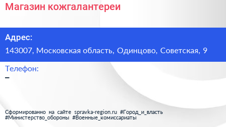 Магазин кожгалантереи по адресу 143007, Московская область, Одинцово, Советская, 9 в дальнейшем Организация, размещена в следующих категориях: