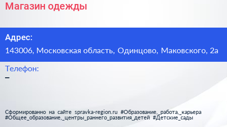 Магазин одежды по адресу 143006, Московская область, Одинцово, Маковского, 2а в дальнейшем Организация, размещена в следующих категориях: