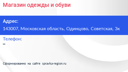 Магазин одежды и обуви по адресу 143007, Московская область, Одинцово, Советская, 3к в дальнейшем Организация, размещена в следующих категориях: