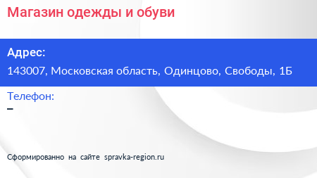 Магазин одежды и обуви по адресу 143007, Московская область, Одинцово, Свободы, 1Б в дальнейшем Организация, размещена в следующих категориях: