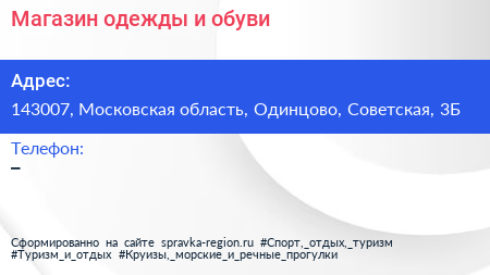 Магазин одежды и обуви по адресу 143007, Московская область, Одинцово, Советская, 3Б в дальнейшем Организация, размещена в следующих категориях: