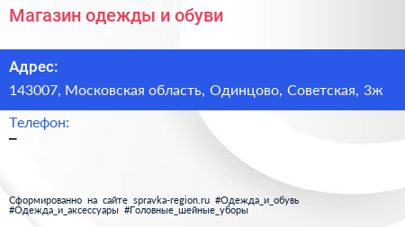 Магазин одежды и обуви по адресу 143007, Московская область, Одинцово, Советская, 3ж в дальнейшем Организация, размещена в следующих категориях: