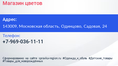 Магазин цветов по адресу 143009, Московская область, Одинцово, Садовая, 24 в дальнейшем Организация, размещена в следующих категориях:
