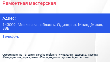 Ремонтная мастерская по адресу 143002, Московская область, Одинцово, Молодёжная, 38Б в дальнейшем Организация, размещена в следующих категориях: