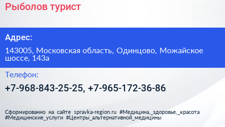 Рыболов турист по адресу 143005, Московская область, Одинцово, Можайское шоссе, 143а в дальнейшем Организация, размещена в следующих категориях: