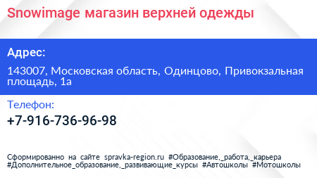 Snowimage, магазин верхней одежды по адресу 143007, Московская область, Одинцово, Привокзальная площадь, 1а в дальнейшем Организация, размещена в следующих категориях: