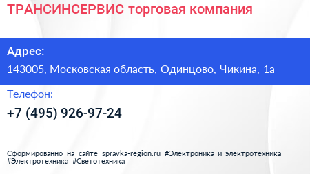 ТРАНСИНСЕРВИС, торговая компания по адресу 143005, Московская область, Одинцово, Чикина, 1а в дальнейшем Организация, размещена в следующих категориях: