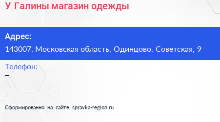 У Галины, магазин одежды по адресу 143007, Московская область, Одинцово, Советская, 9 в дальнейшем Организация, размещена в следующих категориях: