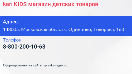 kari KIDS, магазин детских товаров по адресу 143005, Московская область, Одинцово, Говорова, 163 в дальнейшем Организация, размещена в следующих категориях:
