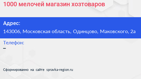 1000 мелочей, магазин хозтоваров по адресу 143006, Московская область, Одинцово, Маковского, 2а в дальнейшем Организация, размещена в следующих категориях: