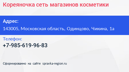 Кореяночка, сеть магазинов косметики по адресу 143005, Московская область, Одинцово, Чикина, 1а в дальнейшем Организация, размещена в следующих категориях: