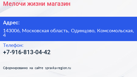 Мелочи жизни, магазин по адресу 143006, Московская область, Одинцово, Комсомольская, 4 в дальнейшем Организация, размещена в следующих категориях: