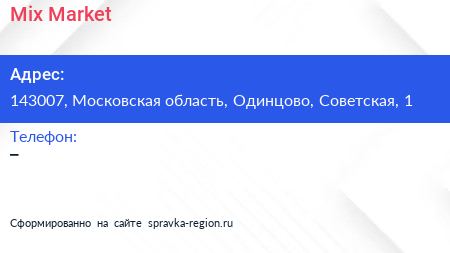 Mix Market по адресу 143007, Московская область, Одинцово, Советская, 1 в дальнейшем Организация, размещена в следующих категориях: