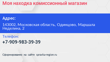 Моя находка, комиссионный магазин по адресу 143002, Московская область, Одинцово, Маршала Неделина, 2 в дальнейшем Организация, размещена в следующих категориях: