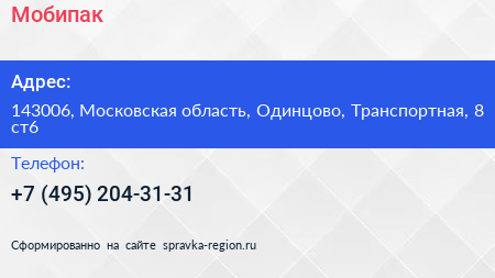 Мобипак по адресу 143006, Московская область, Одинцово, Транспортная, 8 ст6 в дальнейшем Организация, размещена в следующих категориях:
