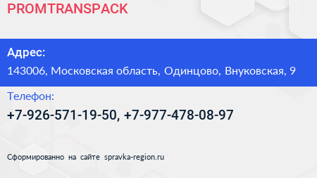 PROMTRANSPACK по адресу 143006, Московская область, Одинцово, Внуковская, 9 в дальнейшем Организация, размещена в следующих категориях: