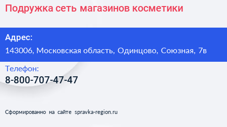 Подружка, сеть магазинов косметики по адресу 143006, Московская область, Одинцово, Союзная, 7в в дальнейшем Организация, размещена в следующих категориях: