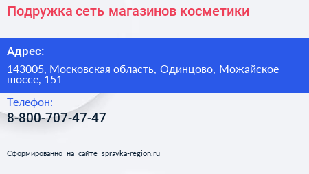 Подружка, сеть магазинов косметики по адресу 143005, Московская область, Одинцово, Можайское шоссе, 151 в дальнейшем Организация, размещена в следующих категориях: