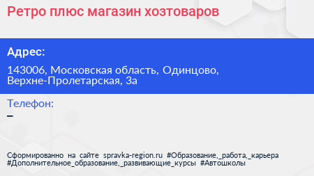 Ретро плюс, магазин хозтоваров по адресу 143006, Московская область, Одинцово, Верхне-Пролетарская, 3а в дальнейшем Организация, размещена в следующих категориях: