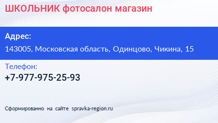 ШКОЛЬНИК, фотосалон-магазин по адресу 143005, Московская область, Одинцово, Чикина, 15 в дальнейшем Организация, размещена в следующих категориях: