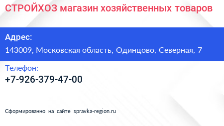 СТРОЙХОЗ, магазин хозяйственных товаров по адресу 143009, Московская область, Одинцово, Северная, 7 в дальнейшем Организация, размещена в следующих категориях: