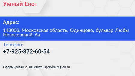 Умный Енот по адресу 143003, Московская область, Одинцово, бульвар Любы Новоселовой, 6а в дальнейшем Организация, размещена в следующих категориях: