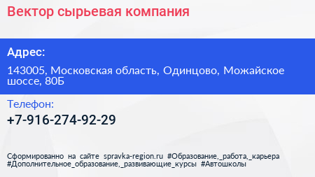 Вектор, сырьевая компания по адресу 143005, Московская область, Одинцово, Можайское шоссе, 80Б в дальнейшем Организация, размещена в следующих категориях: