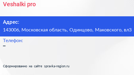 Veshalki-pro по адресу 143006, Московская область, Одинцово, Маковского, вл3 в дальнейшем Организация, размещена в следующих категориях: