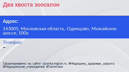 Два хвоста, зоосалон по адресу 143005, Московская область, Одинцово, Можайское шоссе, 100а в дальнейшем Организация, размещена в следующих категориях: