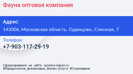Фауна, оптовая компания по адресу 143006, Московская область, Одинцово, Союзная, 7 в дальнейшем Организация, размещена в следующих категориях: