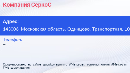 Компания СеркоС по адресу 143006, Московская область, Одинцово, Транспортная, 10 в дальнейшем Организация, размещена в следующих категориях: